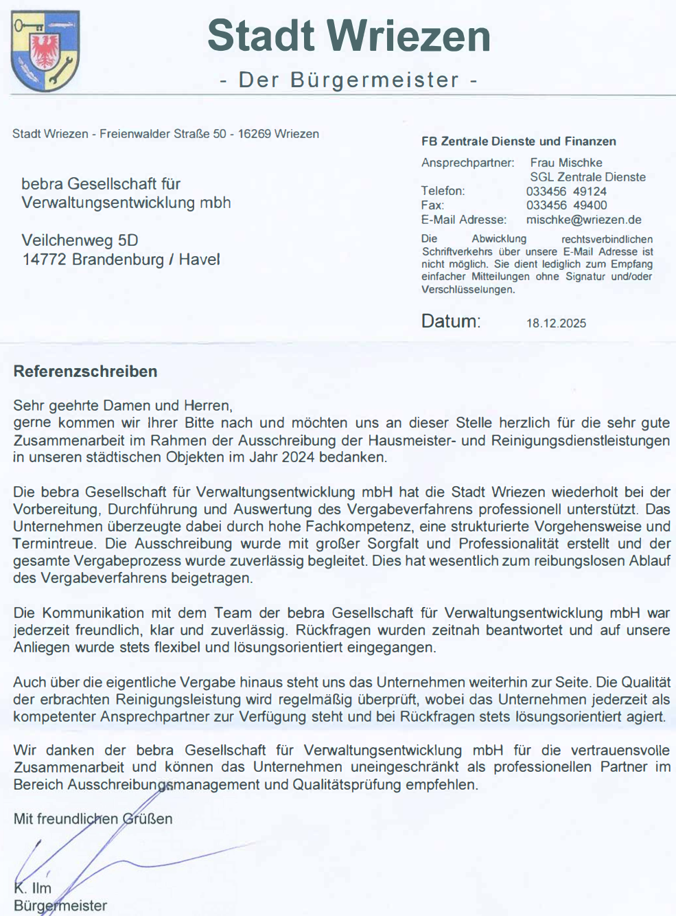 Die bebra Gesellschaft für Verwaltungs­entwicklung mbH hat die Stadt Wriezen wiederholt bei der Vorbereitung, Durchführung und Auswertung des Vergabe­verfahrens professionell unterstützt. Das Unternehmen überzeugte dabei durch hohe Fachkompetenz, eine strukturierte Vorgehens­weise und Termin­treue. Die Ausschreibung wurde mit großer Sorgfalt und Professionalität erstellt und der gesamte Vergabe­prozess wurde zuverlässig begleitet. Dies hat wesentlich zum reibungslosen Ablauf des Vergabe­verfahrens beigetragen.
